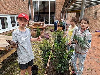 Die Idee zur Nutzung und Verschönerung dieser Bereiche wurde während der letzten Projektwoche in einer Arbeitsgruppe unter der Leitung von Frau Riethmüller erarbeitet. Frau Riethmüller hat sich auch um die Anschaffung des Mobiliars gekümmert und zusammen mit den Kolleg*innen der Schulgarten-AG, Frau Kondring, Herrn Dr. Scheffer und Herrn Reckfort die Bepflanzung bestellt, die dann von den Schüler*innen der Schulgarten-AG mit Unterstützung weiterer Schüler*innen der 6b gestern durchgeführt wurde.