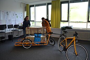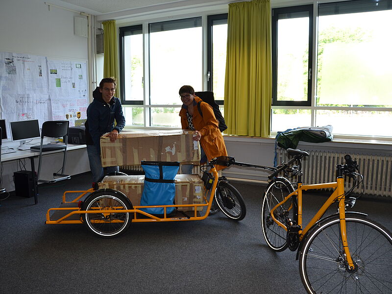 Direkt nach den Osterferien konnte Laura Hebling von vamos e.V per Lastenrad die Ausstellung direkt in den Ausstellungsraum A 9 anliefern. Luca Finn Thomas (Q2) war dankbar, dass die Pakete direkt vor Ort für die Qualifizierung der SchülerInnen ausgepackt und aufgebaut werden konnten.