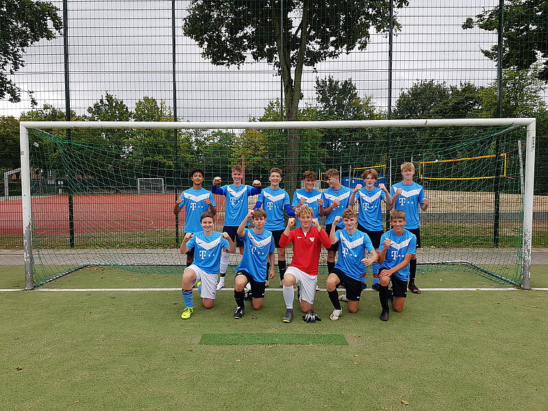 Mit dem dritten Platz auf Stadtebene hat sich die Mannschaft der Oberstufenschüler des Hittorfs bei den diesjährigen Fußballmeisterschaften der Jungen in der WK I einen respektablen Podiumsplatz erkämpft. In der Vorrunde noch unangefochtener Gruppensieger mussten die Hittorfer im Halbfinale auf dem taufeuchten Rasenplatz in Münster-Gievenbeck schnell erkennen, dass es auch andere Schulen gibt, die fußballerisch besonders begabte Schüler in ihren Reihen haben. Dem hohen Spieltempo und konsequenten Pressing waren die Jungs in blau in den ersten Minuten nicht gewachsen. Trotz einer bärenstarken Antwort in Halbzeit zwei, stand am Ende ein unter dem Strich verdientes 5:2 für das KvG-Gymnasium aus Hiltrup auf dem Spielbericht. Unter der Devise „als vierter fahren wir heute nicht nach Hause!“ spielten die Fußballer vom WHG dann im Spiel um Platz drei befreit und spielfreudig groß auf. Mit einem Torspektakel und einem fulminanten 7:4 Sieg gegen das Immanuel-Kant-Gymnasium verabschiedete sich die Mannschaft von den Meisterschaften.