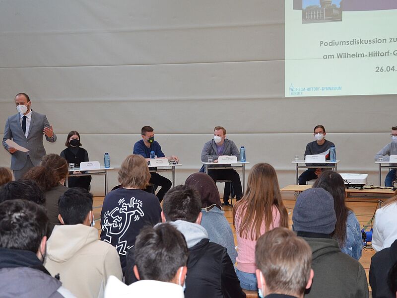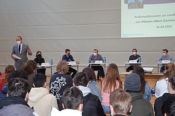 Das Spektrum der Fragen und politischen Themen, die das Podium der 5 Jugendvertreter*innen der Parteien abzuhandeln hatte, war groß – der Zeitdruck entsprechend. In drei 20-minütigen Themenblöcken übernahmen jeweils 2 Schüler*innen aus den SW-Kursen die Leitung der Runde. Publikumsrunden ermöglichten konkrete Nachfragen.