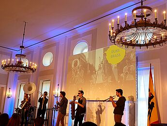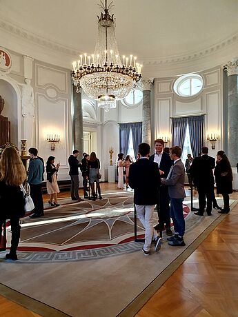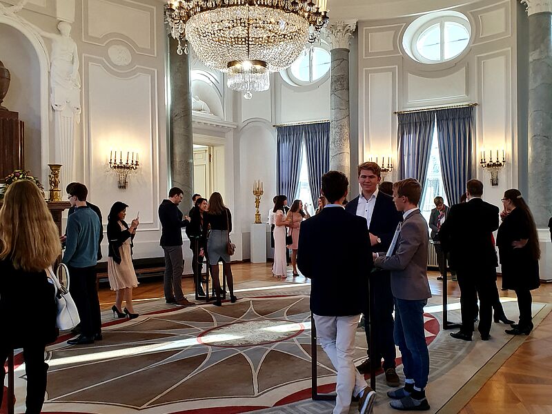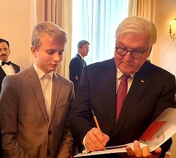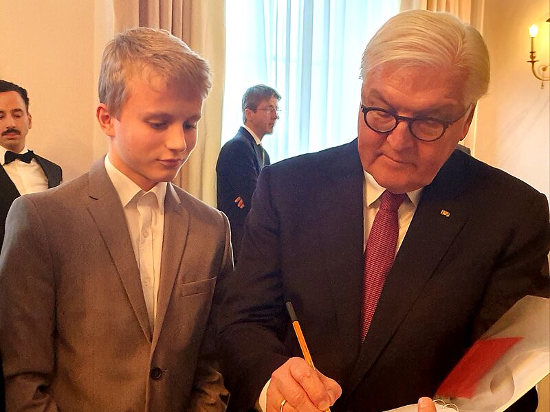Los ging es bereits am Montag mit einem Abendprogramm in dem Berliner Theater im Delphi, wo es u.a. eine Impro-Theater-Darbietung für Schüler, Tutoren und Jury-Mitglieder gab. Am Dienstag morgen versammelten sich dann alle im Schloss Bellevue, um gemeinsam die Erstpreisträger zu „feiern“. Herr Steinmeier nahm sich viel Zeit, um mit allen Jugendlichen ins Gespräch zu kommen, Widmungen auf den Forschungsarbeiten zu hinterlassen oder für Fotos zu posieren. Ein rundum gelungener Abschluss für diese Wettbewerbsrunde!