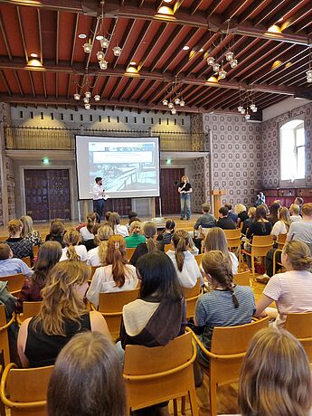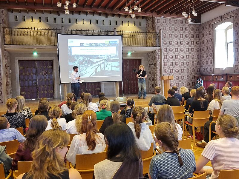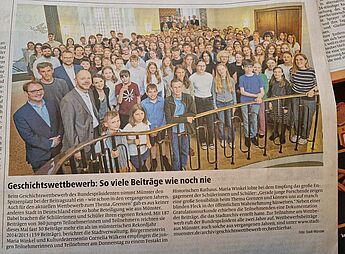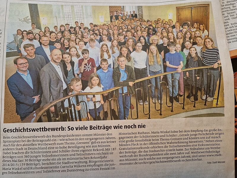 Bürgermeisterin Maria Winkel und Kulturdezernentin Cornelia Wilkens empfingen alle Münsteraner Teilnehmer des Geschichtswettbewerbs am Donerstag zu einem Festakt im Historischen Rathaus. MIt 187 Beiträgen von 360 Teilnehmerinnen und Teilnehmern waren die Münsteraner Schulen diejenigen, die bundesweit am stärksten am Wettbewerb des Bundspräsidenten beteiligt waren. Keine andere Stadt in Deutschland hat mehr Beiträge eingesandt. Jetzt heißt es für die Landessieger Daumendrücken, denn im Novemember werden die Bundessieger benannt.