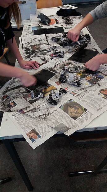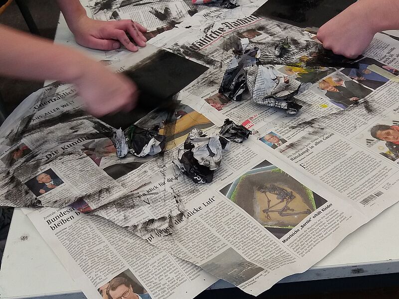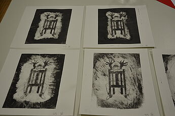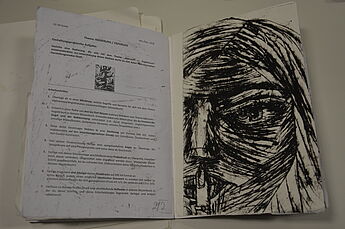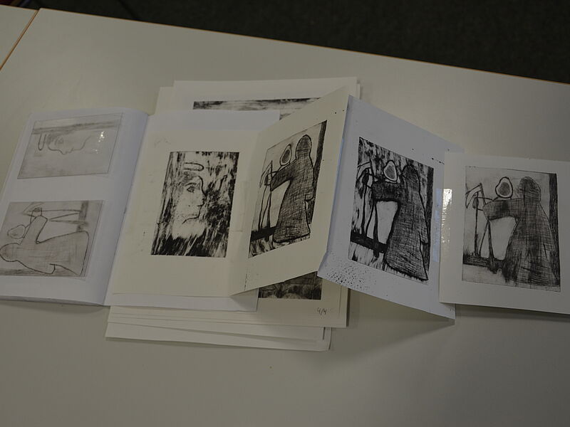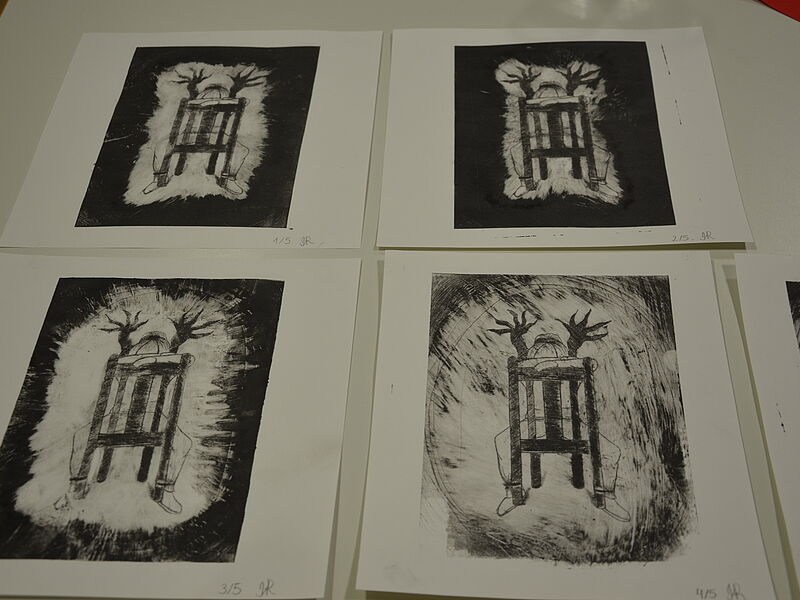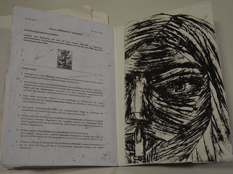 Die 14 Schülerinnen und Schüler des Grundkurses haben sich in den vergangenen Wochen v.a. mit Radierungen des Künstlers Francisco de Goya auseinandergesetzt, um sich anschließend selbst in die Technik des Druckverfahrens einzuarbeiten, eigene Druckplatten zu dem Thema "Albtraum/Angstraum" zu entwickeln und schließlich individuelle Radierungen anzufertigen. Zahlreiche Skizzen und Probedrucke sowie die Ergebnisse ihrer praktischen Arbeit haben sie dafür in ihren Skizzenbüchern festgehalten.