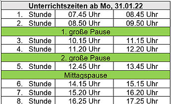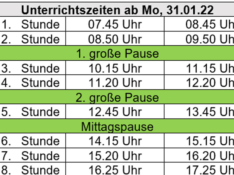 Folgende Unterrichtszeiten gelten wieder ab Montag, 31.01.22:
