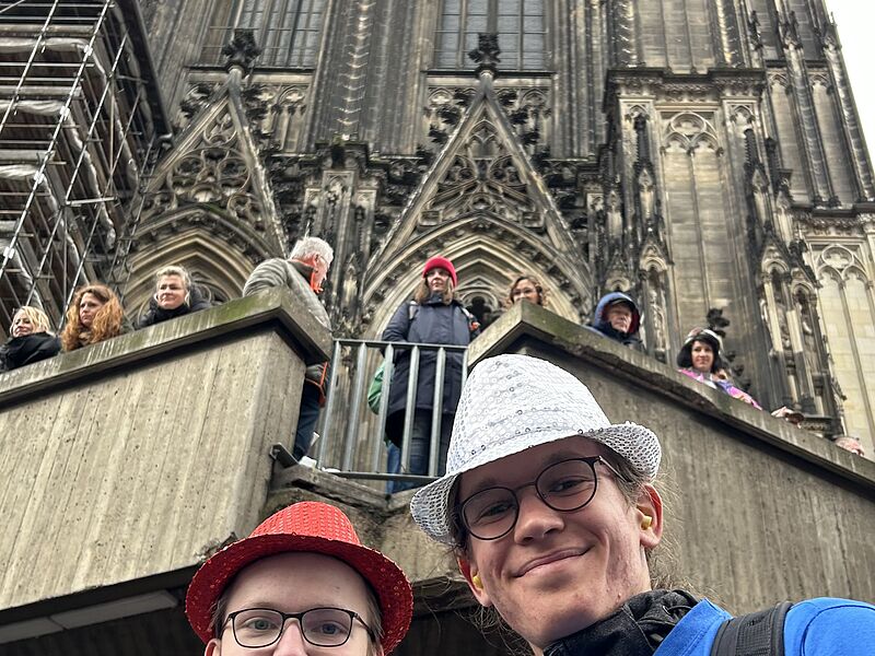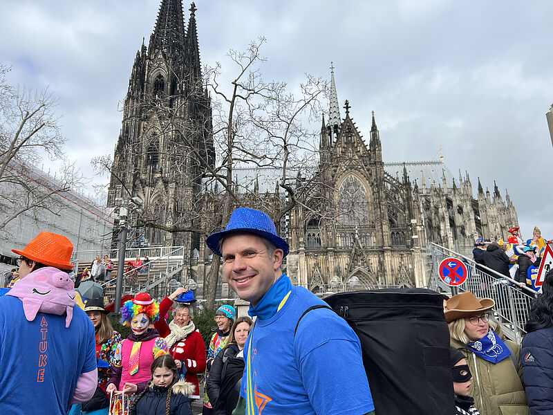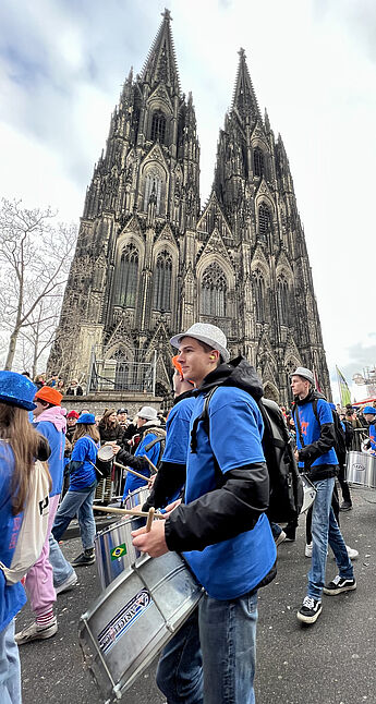 Kölle alaaf! Die Samba-AG war auch dieses Jahr wieder beim traditionellen „Schull- und Veedelszöch“ dabei und unterstützte die befreundeten Trommler*innen des Kölner „Humboldt-Gymnasiums“ tatkräftig. Mit der Startnummer 42 ging es dieses Mal untypischerweise von der anderen Rheinseite los, denn der Kölner Karneval feierte in diesem Jahr sein 200-jähriges Jubiläum und auch die „Schäl Sick“ sollte dieses Mal in den Genuss des Zuges kommen. Bereits beim Beginn in Köln-Deutz, spätestens aber kurze Zeit später vor der beeindruckenden Kulisse des Doms, war klar, dass es – trotz des etwas durchwachsenden Wetters - wieder ein fantastischer Zug werden würde.