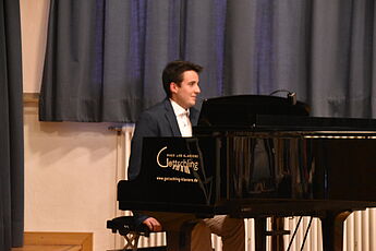 Mit musikalischen Zwischenspielen am Flügel holt uns Luca Zimnick auf höchst elegante und luftig-lässige Weise von den durch die Szenen verursachten Stimmungen des Lachens oder Nachdenklichseins wieder in einen Zustand der gespannten Aufmerksamkeit und Klarheit zurück: Worum geht es wohl in der nächsten Szene?