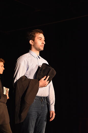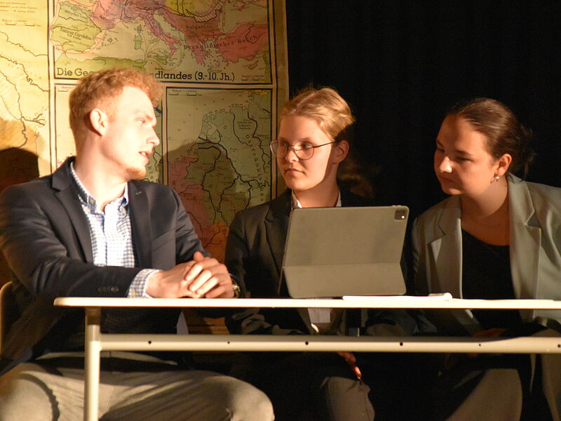 Als in einer Szene eine Matura-Prüfung vorgeführt wird, die in einer quasireligiösen Schwärmerei des Prüflings (Laura Krug) Hitler gegen Goethe ausspielt, bleibt den Zuhörer*innen fast das Lachen im Halse stecken. In der besten Szene des Abends (gespielt von David Klein, Anish Kastens, Laura Krug) unterbrechen sich zwei Menschen ständig beim Erzählen eines Witzes und steigern sich in gegenseitige Wut hinein, da hört man es im Publikum tuscheln: „Das ist ja wie bei meinen Eltern!“. Auf bestürzende und komische Weise hat das alles viel mit uns zu tun, obwohl die Texte fast 100 Jahre alt sind.