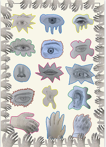 Der EF Kunstkurs G1 forscht davon ausgehend zeichnend zum menschlichen Körper und überträgt die einzelnen analogen Studien in digitale Collagen. Inspiriert von der Ästhetik wissenschaftlicher Sammlungen gestalten die Künstlerinnen und Künstler ein eigenes Poster. Die Zeichnungen aller Kursmitglieder finden auf diese Weise zu einem neuen Ganzen zusammen. Die digitalen Collagen von Tai Nguyen und Juna Ackermann wurden vom Kurs als repräsentative Beispiele ausgewählt. Anhand der beiden Ergebnisse wird deutlich, wie die gleiche Sammlung von Zeichenstudien allein durch eine unterschiedliche Anordnung zu neuen und individuellen Kunstwerken werden kann.