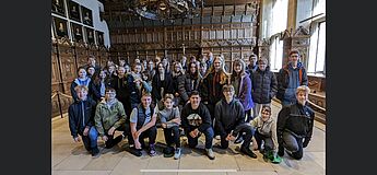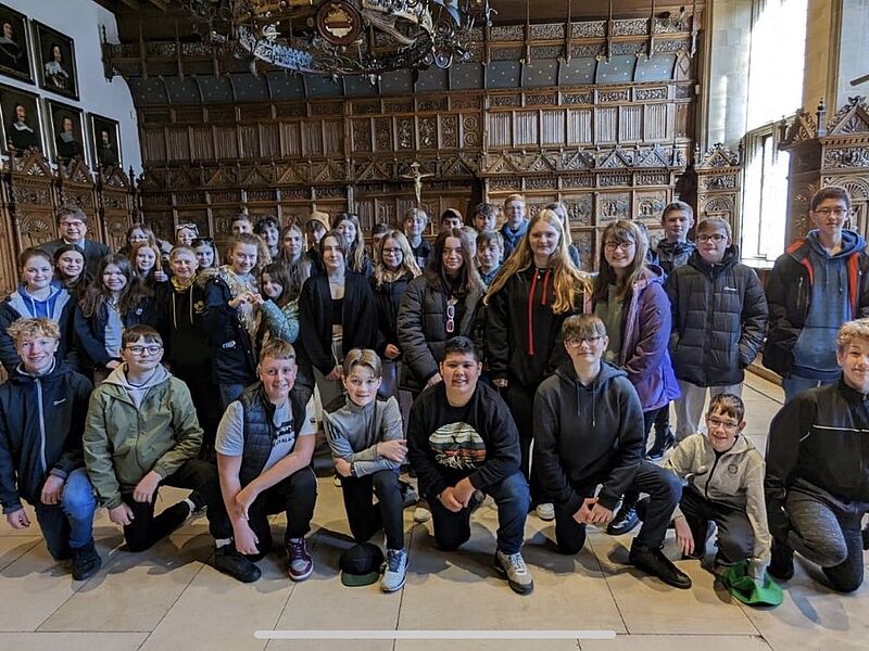 Am Mittwoch machten sich die englischen Schüler*innen zusammen mit ihren Lehrkräften zu Fuß auf den Weg in Münsters Innenstadt. Nach einer Visite des Marktes am Domplatz, bot sich im Café "1648" bei einem Getränk die Gelegenheit, Münster im Sonnenschein von oben zu bestaunen. Bei einem Stadtspiel fanden die Gäste einiges über die Stadt Münster heraus. Um 12 Uhr freuten sich unsere Gäste über den herzlichen Empfang im Friedenssaal durch Bürgermeister Klaus Rosenau, bevor sie den Rückweg zum WHG antraten.