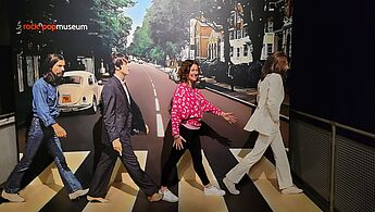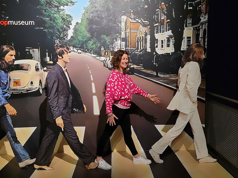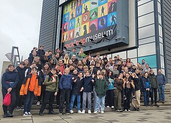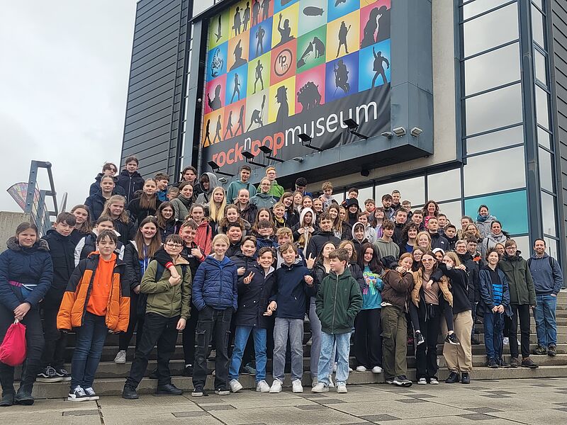Am Dienstag unternahmen alle zusammen (80 Schüler*innen + 6 Lehrkräfte) einen Ausflug. Zunächst ging es mit dem Bus in das Rock`nPop Museum nach Gronau. Neben der beeindruckenden Ausstellung, in der viele englische Schüler*innen zum ersten Mal von Udo Lindenberg erfuhren, gab es die Gelegenheit, im sogenannten "Green Room" eigene PopStar-Erfahrungen bei einem Karaoke Auftritt zu sammeln. Der gemeinsame Auftritt der englischen und deutschen Lehrer*innen wurde durch großen Applaus gewürdigt. Anschließend ging es über die Grenze in Münsters niederländische Partnerstadt Enschede. Dort hatten die Schüler*innen Gelegenheit, den Markt zu besuchen und die Stadt in zu erkunden.