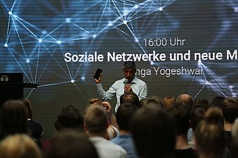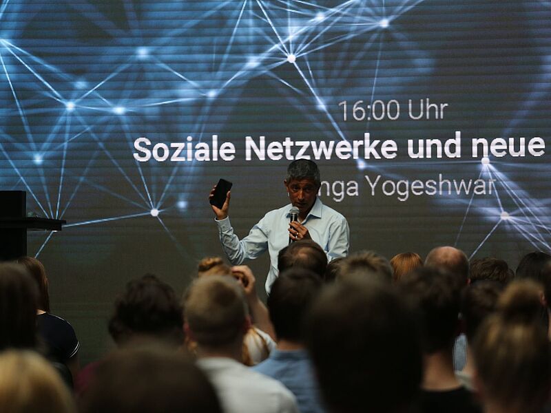 In einer lebhaften Aussprache mit Ranga Yogeshwar wurden aktuelle Trends und Entwicklungen in der Digitalisierung thematisiert und diskutiert: Ist uns bewusst, dass wir bei unserer digitalen Kommunikation mit Daten bezahlen? Was ist ein Eye-Tracking-System? Müssen und können wir uns vor Ortungsdiensten schützen? Wie kann ich im Netz wahre Informationen und fake news unterscheiden? Welche politischen und rechtlichen Kontrollmöglichkeiten sind überhaupt möglich?