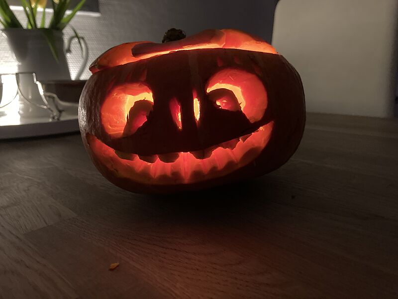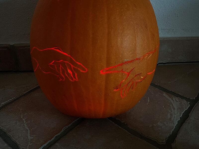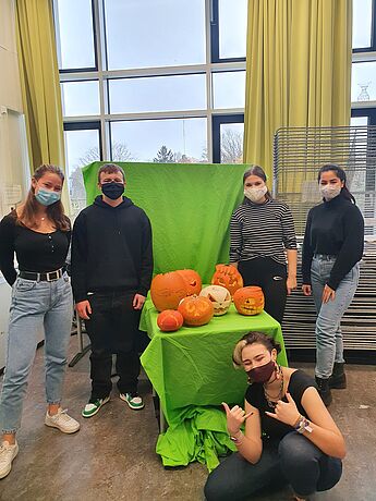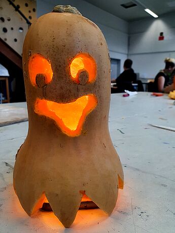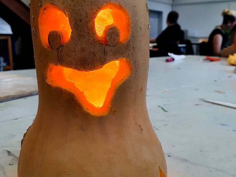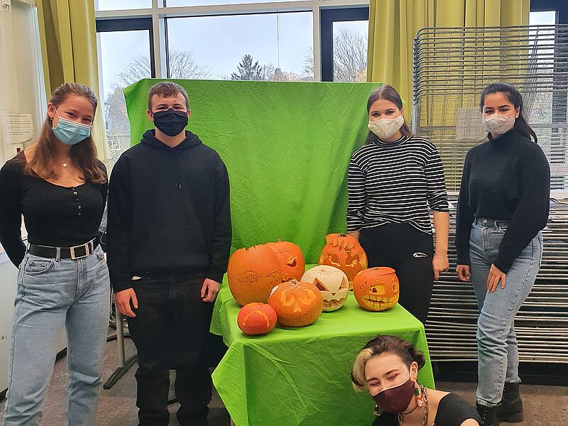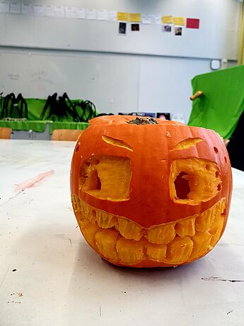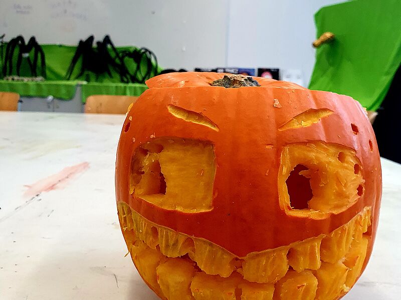 Innerhalb der Unterrichtsreihe zu Louise Bourgeois, einer Künstlerin, die vor allem für ihre riesengroßen Spinnen-Skulpturen im öffentlichen Raum bekannt ist, erstellten die Schülerinnen und Schüler des Kunst-LKs große Spinnen aus Draht, Pappmaschee und weiteren Materialien. Da eine Ausstellung aus Brandschutzgründen im Schulgebäude nicht möglich ist, wurde kurzerhand eine Lösung für das Problem gefunden und die Green Screen App auf den Schul-Ipads genutzt, um die erstellten Spinnen doch noch im Schulgebäude präsentieren zu können. Die Ergebnisse lassen sich sehen und werden ab den kommenden Woche auch als Fotos bzw. QR-Code-Ausstellung im Gebäude zu sehen sein. Zum Abschluss der Reihe versetzten sich die LK-Schüler*innen - passend zu Halloween - noch ein weiteres Mal in Grusel-Stimmung und bearbeiteten Kürbisse mit Linolschnittwerkzeugen, Schnitzmessern und Radiernadeln, um das Thema "Skulptur" mal etwas anders zu erproben.