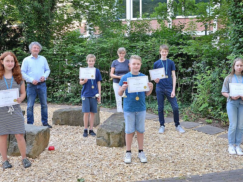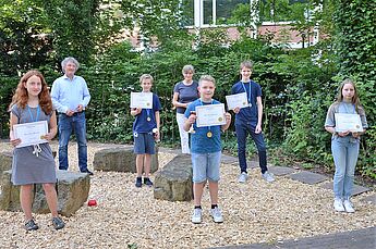 Nachdem die Ergebnisse letzte Woche herauskamen und in den einzelnen Klassen bereits Urkunden und kleine Sachpreise an die Teilnehmer verliehen wurden, wurden nun auch die Jahrgangsbesten geehrt. Ihre besondere Auszeichnung (Urkunde, Medaille und attraktive Preise) nahmen als Jahrgangsbeste in Empfang: