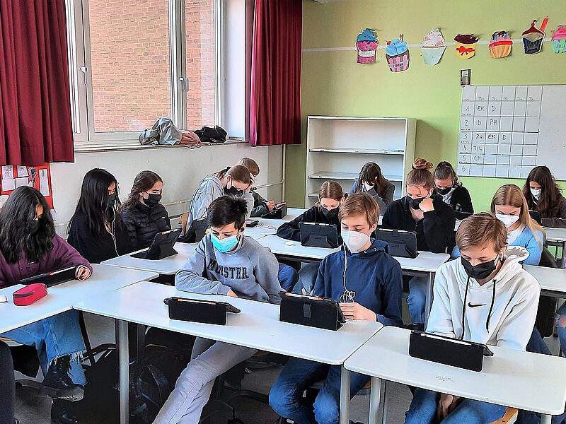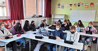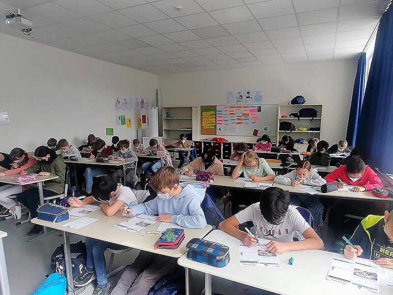 Während die Schüler*innen aus der 5 – 7 den Test in der gewohnten Papierform machten, führten die 8- und 9-Klässler*innen den Wettbewerb erstmals auf ihren eigenen Tablets online in der Schule durch und hatten auch Aufgaben zum Hörverstehen zu erledigen.