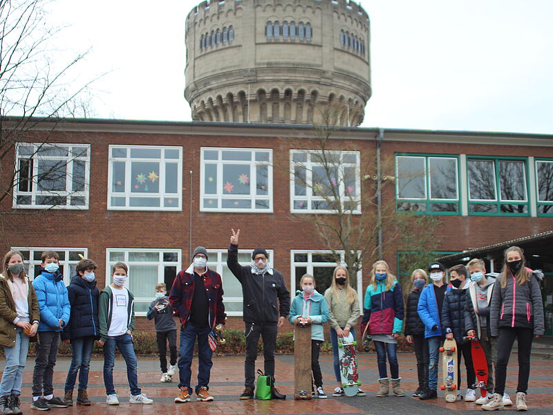 Zwölf Spurensucher*innen der 6. Klasse des Wilhelm-Hittorf-Gymnasiums beschäftigen sich im Rahmen des Geschichtswettbewerbs des Bundespräsidenten schon länger mit dem Thema „Skaten macht Gesellschaft“. Sie sind dabei ganz besonders der Geschichte von Titus Dittmann auf der Spur, der doch tatsächlich von 1978 bis 1980 sein Referendariat am WHG gemacht hat, damals auch in unserer Turnhalle eine Skate-AG auf die Beine stellte und ganz nebenbei den Sport „Skateboarden“ in Münster revolutionierte, indem er u.a. seinen Schülern Skateboards aus den USA mitbrachte und bei der Etablierung des ersten Skateparks in Münster maßgeblich mitwirkte.
