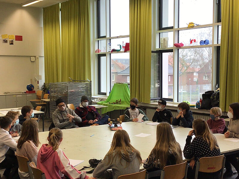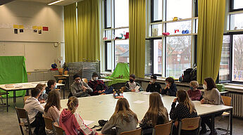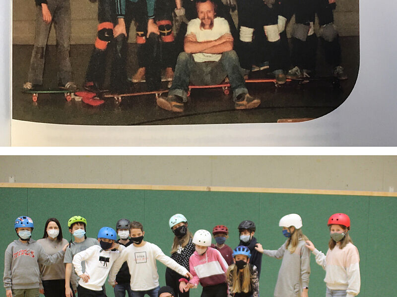 Dort stellten wir das alte Skate-AG-Foto aus dem Jahr 1978 zusammen mit Titus Dittmann nach! Die zwölf jungen Forscher*innen haben bereits im Vorfeld viel über Titus Dittmann „erforscht“, waren z.B. im Stadtarchiv und haben dort auch Zeitungsartikel aus dem Jahr 1989 vorgefunden. Dank der Gespräche mit den Zeitzeugen haben sie erfahren, dass es sogar noch ältere Zeitungsartikel gibt, die u.a. im „Privatarchiv“ von Ralf Middendorf noch existieren und den Forscher*innen zur Verfügung gestellt werden können. WOW - das ist erfolgreiche Recherche! Ein rundum gelungener Projekttag mit sehr vielen „Fragen und Antworten“, aber auch „Spiel und Spaß“ rund ums Skateboarding. Wie schön, dass dieser Projekttag noch stattfinden konnte. Titus Dittmann – der übrigens Pate für das Wilhelm-Hittorf-Gymnasium ist – hatte sich extra kurz vor seinem Besuch noch auf Corona testen lassen (mit negativem Ergebnis!), um die fünf Schülerinnen und sieben Schüler der AG besuchen zu können. Die Geschichts-AG mit ihrer Lehrerin Frau Reinhart sagt „DANKE“ für einen einzigartigen Tag, der allen noch sehr lange in Erinnerung bleiben wird.