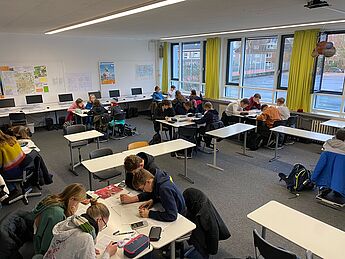 Am Dienstag, 17.01.23, fand an unserer Schule der Bolyai-Wettbewerb endlich wieder in Präsenz statt. Die Besonderheit dieses Wettbewerbs: Die insgesamt 14 Aufgaben werden innerhalb einer Stunde gemeinsam in einer Vierergruppe bearbeitet.