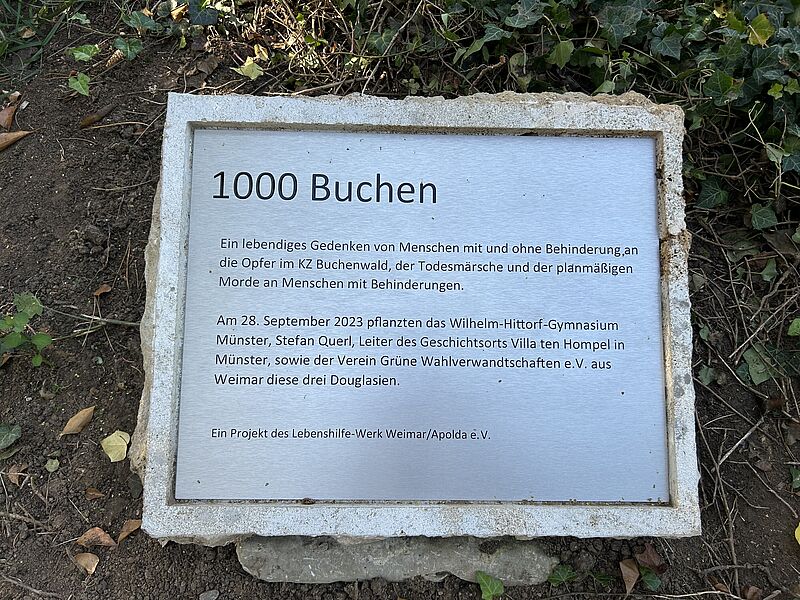 Das Projekt "1000 Buchen – Ein lebendiges Gedenken" der Lebenshilfe Weimar möchte die Erinnerung an das im Nationalsozialismus Geschehene lebendig halten und sich ganz aktuell für eine weltoffene und vielfältige Gesellschaft ohne Ausgrenzung und Rassismus einsetzen.