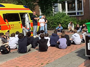 Antworten auf diese und viele weitere Fragen rund um das Thema Unfallprävention bekamen die Schülerinnen und Schüler der 7. Klassen auf unserem Schulhof im Rahmen eines Aktionstages der Kinderneurologie-Hilfe Münster.