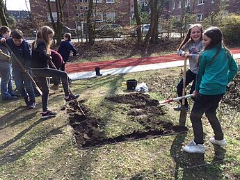 Die ersten Spatenstiche sind schon längst getan und was vorher nur ein Stück Rasen war, sieht jetzt schon aus wie ein richtiges Beet. „Das sieht viel schöner aus als nur Gras“, findet eine Oberstufenschülerin, die vorbeiradelt als 15 fleißige Gärtner und Gärtnerinnen aus den fünften und sechste Klassen die Beete ausbuddeln. In der Sonne werden Steine geschleppt, Schubkarren balanciert und Samen ausgestreut. Leider konnten nicht alle Gartenbegeisterte einen Platz in der neuen Schulbeet- AG ergattern. Frau Westhues, die die Idee für die AG hatte, musste losen und tröstet diejenigen, die nicht dabei sind, mit einer Warteliste. Ideen haben die Schülerinnen und Schüler reichlich: Hochbeete sollen es sein, Erdbeeren und Kräuter. Gegossen wird in den Pausen, Freiwillige finden sich schnell. Jetzt warten alle darauf, dass die Pflanzen wachsen. Wer dabei zusehen will, findet das neue Beet bei der Sportanlage auf dem Weg zum Fahrradkeller. (Text: Sivia Taubert)