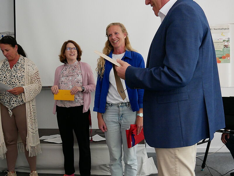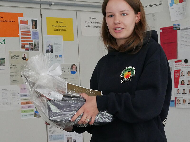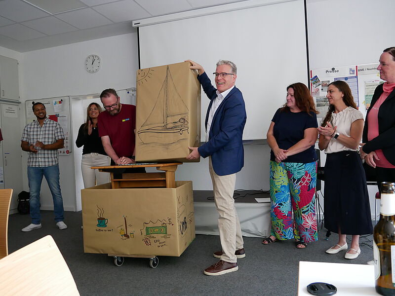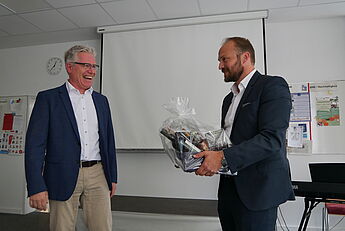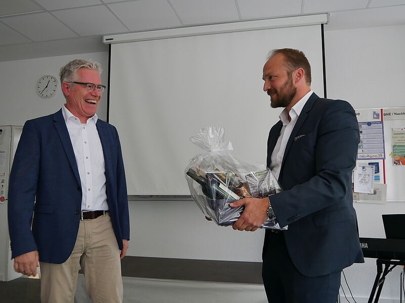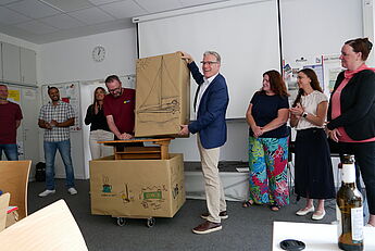 Schulleiter Thorsten Korfsmeier dankte ihm in seiner Rede für seine starke Unterstützung in Schulleitungsangelegenheiten, die Fachschaften Französisch und Religion sangen zusammen ein umgeschriebenes Lied der Sängerin Zaz ("Je veux"), begleitet von Andreas Marcus am Klavier. Die Elternpflegschaftsvorsitzende, Frau Dr. Ruth Epping, betonte beeindruckt die Entschiedenheit Heinemanns in Corona-Zeiten im Einsatz für die gesunde Schule. Das Kollegium, vertreten durch den Lehrerrat, überreichte symbolische Geschenke, die allesamt die große Dankbarkeit der Lehrerinnen und Lehrer ausdrückten, für die Dirk Heinemann ein fester, sicherer Anker in bewegten Zeiten war. Auch die SV dankte Herrn Heinemann für sein offenes Ohr. Die Schulverwaltungsmitarbeitenden und die Hausmeister schenkten Heinemann ein Schreib-Pult aus dem Alt-Bestand des WHG als Erinnerungsgegenstand. Sie betonten seine Kollegialität und erzählten, dass sie die Besprechungsrunden sehr vermissen würden.