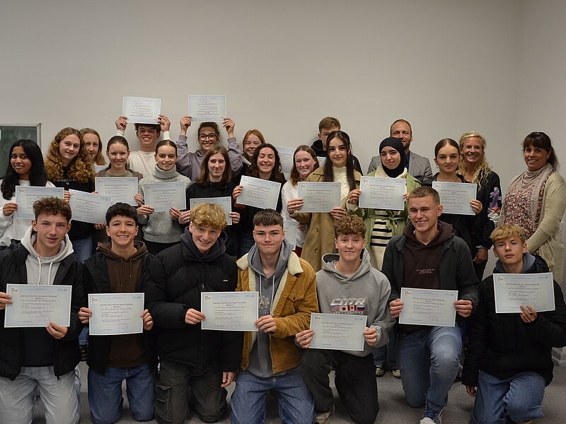 Bereits im letzen Schuljahr haben sich die Schüler*innen im Rahmen einer AG (Klasse 9) oder innerhalb des Regelunterrichts (Jahrgang Q1) auf die schriftlichen und mündlichen Prüfungen auf den Niveaustufen A2 und B1 vorbereitet und diese im Mai/ Juni abgelegt. Die Ergebnisse der Prüfungen haben die Teilnehmer:innen bereits vor den Sommerferien erhalten, und nun konnten sie auch das offizielle Sprachendiplom, ausgestellt von der französischen Regierung, in Empfang nehmen.