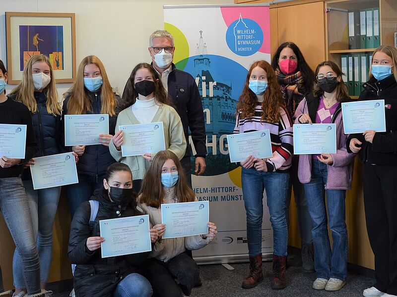 14 Schülerinnen der Klassen der aktuellen Klassen 9-Q1 konnten endlich ihre DELF Diplome durch die Schulleitung in Empfang nehmen. Die Prüfungen hatten bereits im letzten Schuljahr unter erschwerten Bedingungen stattgefunden.
