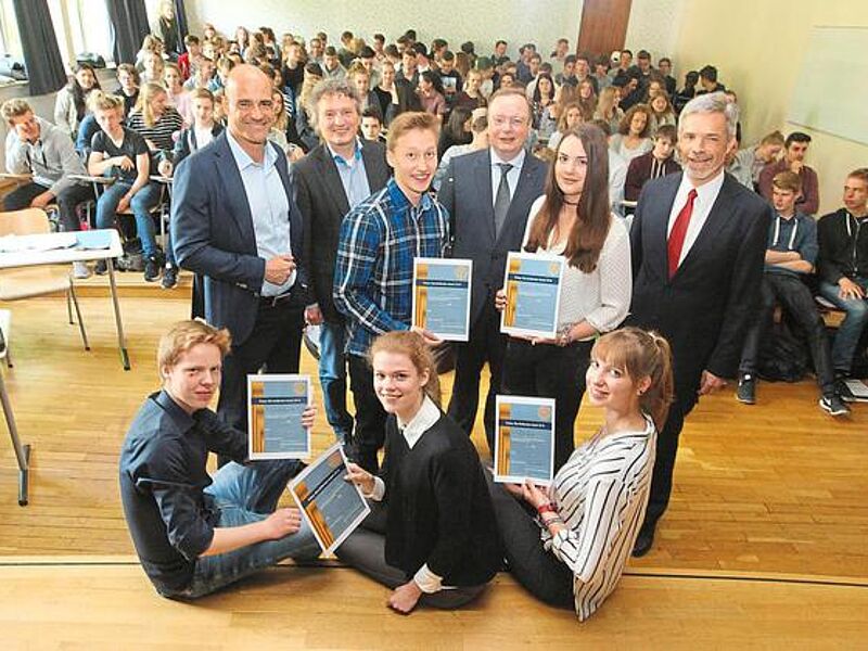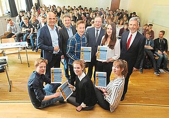 Urkunden für gute Vorträge: Luis Glahn (hintere Reihe, 3.v.l.) erhielt den ersten Preis. Jeweils einen zweiten Preis erhielten (vorne v.l.): Linus Kappenberg, Lina Tölle, Sarah Lohmann und Friederike Hahlweg (hintere Reihe). Schulleiter Christian Schrand (2.v.l.) begrüßte als Jury Christian Gutsche (Geschäftsführer der Oevermann Immobilien GmbH, l.), Christopher Bickmann (Vorstandsvorsitzender der Darlehnskasse Münster, 2.v.r.) und Wirtschaftsprüfer Dr. Michael Ammerwirth (r.).