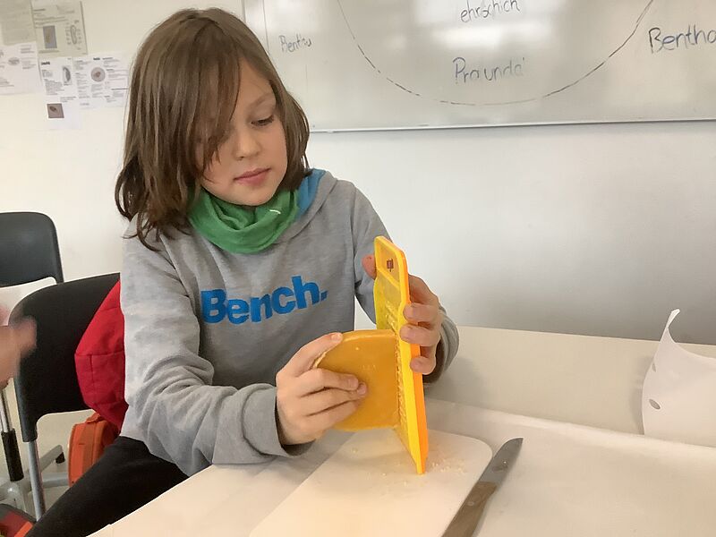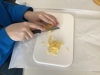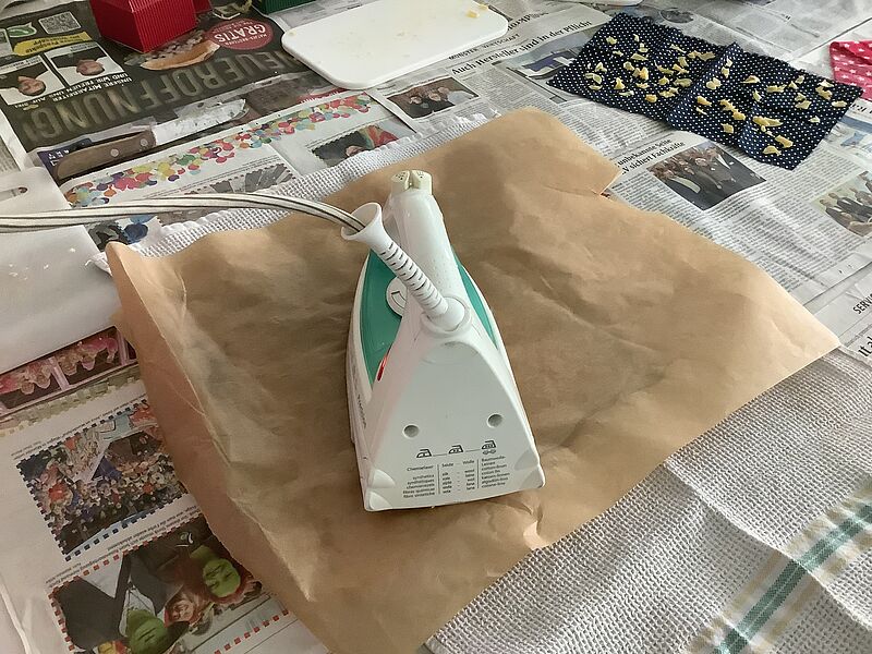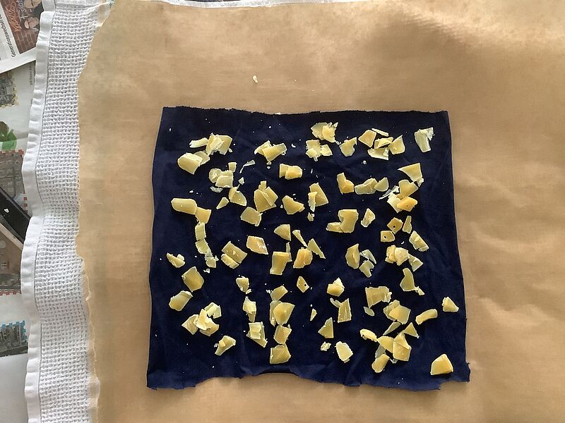 Mit Messern und Reiben haben wir das Wachs zerkleinert und dann diese kleinen Stücke auf das Stoffstück verteilt. Davor sollte man natürlich den Tisch gründlich abdecken, mit Zeitung und Backpapier am besten. Danach haben wir zwei Schichten Backpapier auf den Stoff gelegt und mit dem Bügeleisen alles gebügelt. Wir haben so lange gebügelt, bis das ganze Wachs geschmolzen war. Man muss hier gut aufpassen, dass man nicht zu viel Wachs nimmt, ansonsten läuft es an der Seite heraus. Alternativ könnte man das Wachs auch in einem Topf erwärmen und dann mit einem Pinsel verteilen. Allerdings kann man den Topf dann nicht mehr für andere Dinge benutzen. Nach dem Bügeln entfernt man das Backpapier und kann das Wachstuch benutzen. Will man es benutzen, kann man das Wachstuch mit den Händen etwas erwärmen und dann z.B. um ein Butterbrot wickeln. Nach dem Gebrauch kann man es einfach mit lauwarmem Wasser abwaschen. Das Wachstuch kann man zum Einwickeln oder Abdecken von fast allen Lebensmitteln benutzen, außer Fleisch und Fisch kann man alles damit einpacken. Das liegt daran, dass auf Fleisch und Fisch häufig Bakterien zu finden sind. Die Wachstücher können zwar mit warmem Wasser abgewaschen werden, aber nicht mit heißem Wasser.
