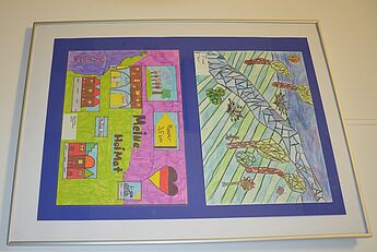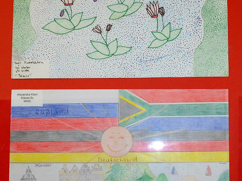 Als letzte Etappe der Ausstellung sind die Bilder nun zusammen mit Arbeiten aus einer israelischen Partnerschule an die Münsteraner Schulen zurückgekehrt. Am WHG hängen zurzeit im Verwaltungsflur Bilder von Schülerinnen und Schüler der Tamir-Grundschule aus Rischon LeZion gemeinsam mit den Bildern der Schülerinnen und Schüler des WHGs.