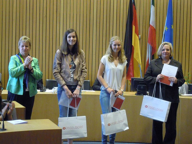 Wir gratulieren Mina Noack ganz herzlich, die ihre Freude an der englischen Sprache, Kreativität und gesunden Ehrgeiz bewiesen hat! Da sich Mina am 1. Juni noch auf einer Austauschfahrt in Frankreich befand, nahm ihre Mutter für sie im Düsseldorfer Landtag ihre Siegerurkunde und attraktive Preise, einen Geldpreis, ein Englischlexikon, eine Lektüre und eine „Gewinner-Tasse“, entgegen.