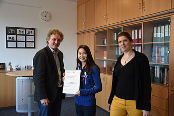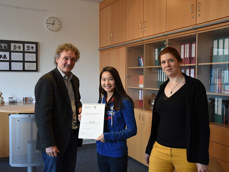 Von Herrn Schrand und Frau Thomas bekam Joslyn am Mittwoch, dem 21.12.2016, eine Urkunde des Europa-Ministers von NRW, Franz-Josef Lersch-Mense, überreicht.