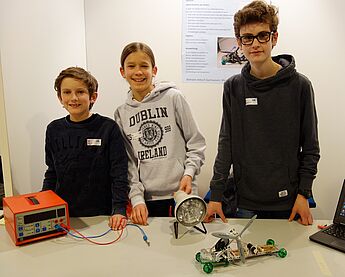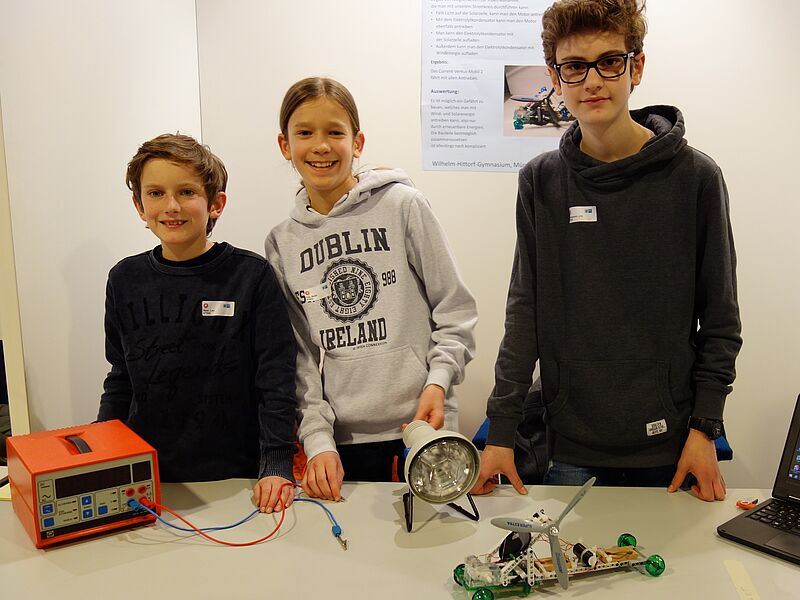 Malte Cox , Leo Roer (Jgst. 7) und Urs Mersmann (Jgst. 8) entwickelten ihr Aqua-Pneumo-Current-Mobil 1 aus dem letzten Jahr, das damals mit einem zweiten Platz gewürdigt wurde, weiter zum Current-Ventus-Mobil 2 (CVM 2). "Ihr habt nicht locker gelassen und das Mobil weiterentwickelt. In diesem Jahr hat alles auch super funktioniert", stellte die Jury in ihrer Laudatio zum ersten Platz im Fachgebiet "Technik" fest. Die drei dürfen ihr CVM 2 beim Landeswettbewerb am 3./4. Mai 2019 in Essen nochmals einem größeren Wettbewerb stellen.