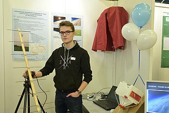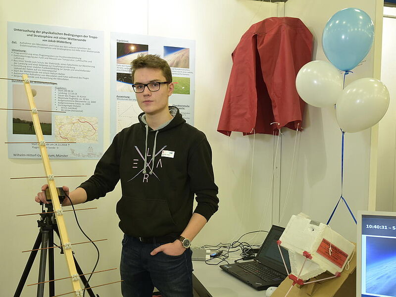 Jakob Middelberg baute eine Wettersonde, die bis in die Stratosphäre aufstieg. Da er nicht nur technische Fragen dabei löste, sondern auch die Steuerung, die Aufnahme und Auswertung der Messdaten, sowie beeindruckende Fotos überzeugend präsentieren konnte, honorierte die Jury diese Arbeit mit einem ersten Platz als beste interdisiplinäre Arbeit. Er qualifizierte sich damit für den Landeswettbewerb in Leverkusen vom 1. bis zum 3. April 2019.