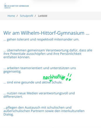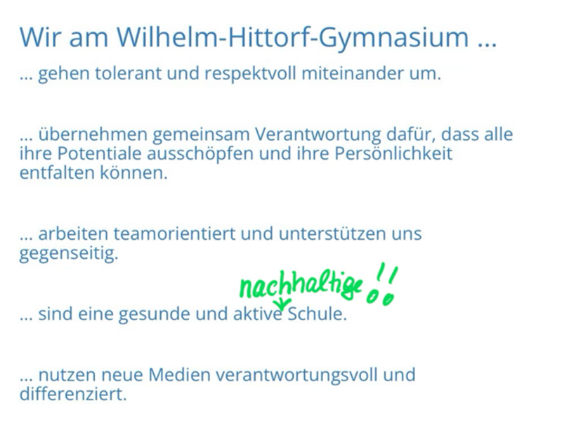 Wir möchten unsere Schülerinnen und Schüler dazu befähigen, nicht nur Wissen zu erwerben, sondern die Zukunft mitzugestalten. Daher haben wir in allen Gremien der Schule, in der Schülervertretung, auf der Elternpflegschaft und auf der Lehrerkonferenz beschlossen, dies auch sichtbar in unserem Leitbild festzulegen: Wir sind nun auch offiziell eine nachhaltige Schule!