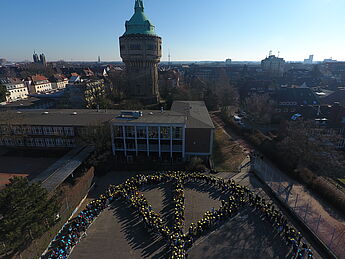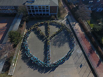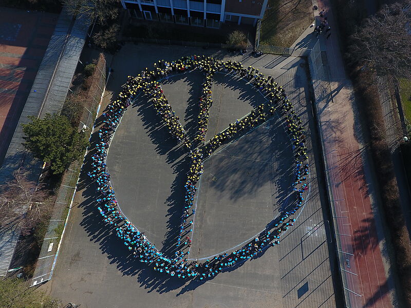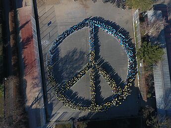 Als gemeinsames solidarisches Zeichen gegen den Krieg, die Angst und das Leid versammelten sich ca. 900 Hittorfer:innen auf dem Schulhof und formten zusammen ein Friedenssymbol.