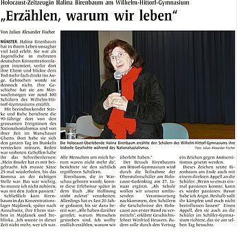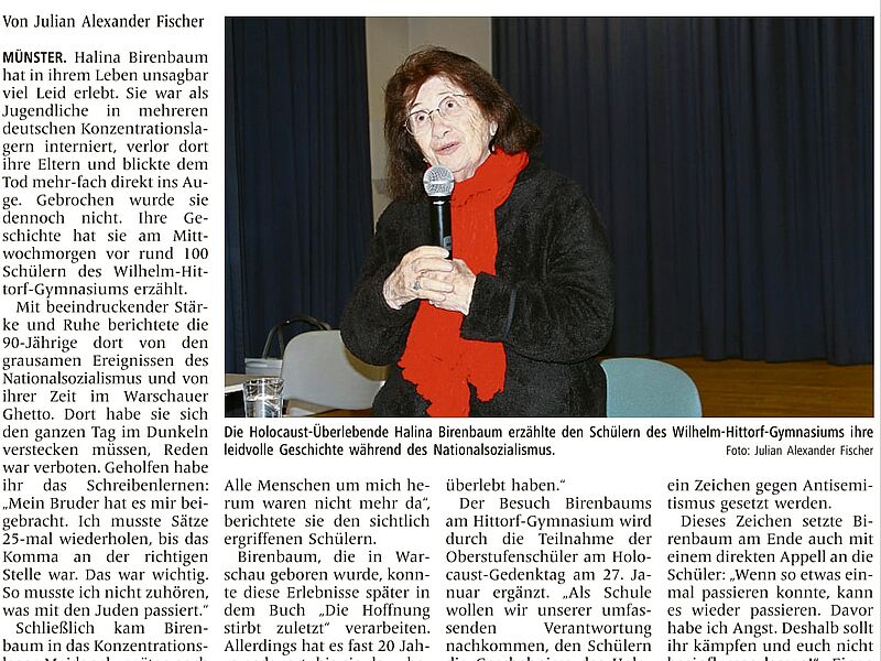 Halina Birenbaum gelang es, die Zuhörerschaft mit ihrer dramatischen Geschichte in den Bann zu ziehen. Immer wieder wurde deutlich, dass die Hoffnung auf eine bessere Zukunft, und sei es in einem anderen Konzentrationslager, ihr Kraft gegeben hat. Mit dieser Kraft hat sie die für uns kaum fassbaren Greuel des Holocausts überlebt. Als Zuhörer gewinnt man den Eindruck, dass es für sie eine Herzensangelegenheit ist, ihre Lebensgeschichte an nachfolgende Generationen weiterzugeben.